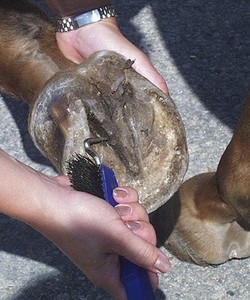 - po oschnutí se potře stěna, chodidlo a rohová střelka nesoleným tukem nebo vazelínou, aby se zabránilo unikání vlhkosti z kopyta a přílišnému vyschnutí kopytního rohu